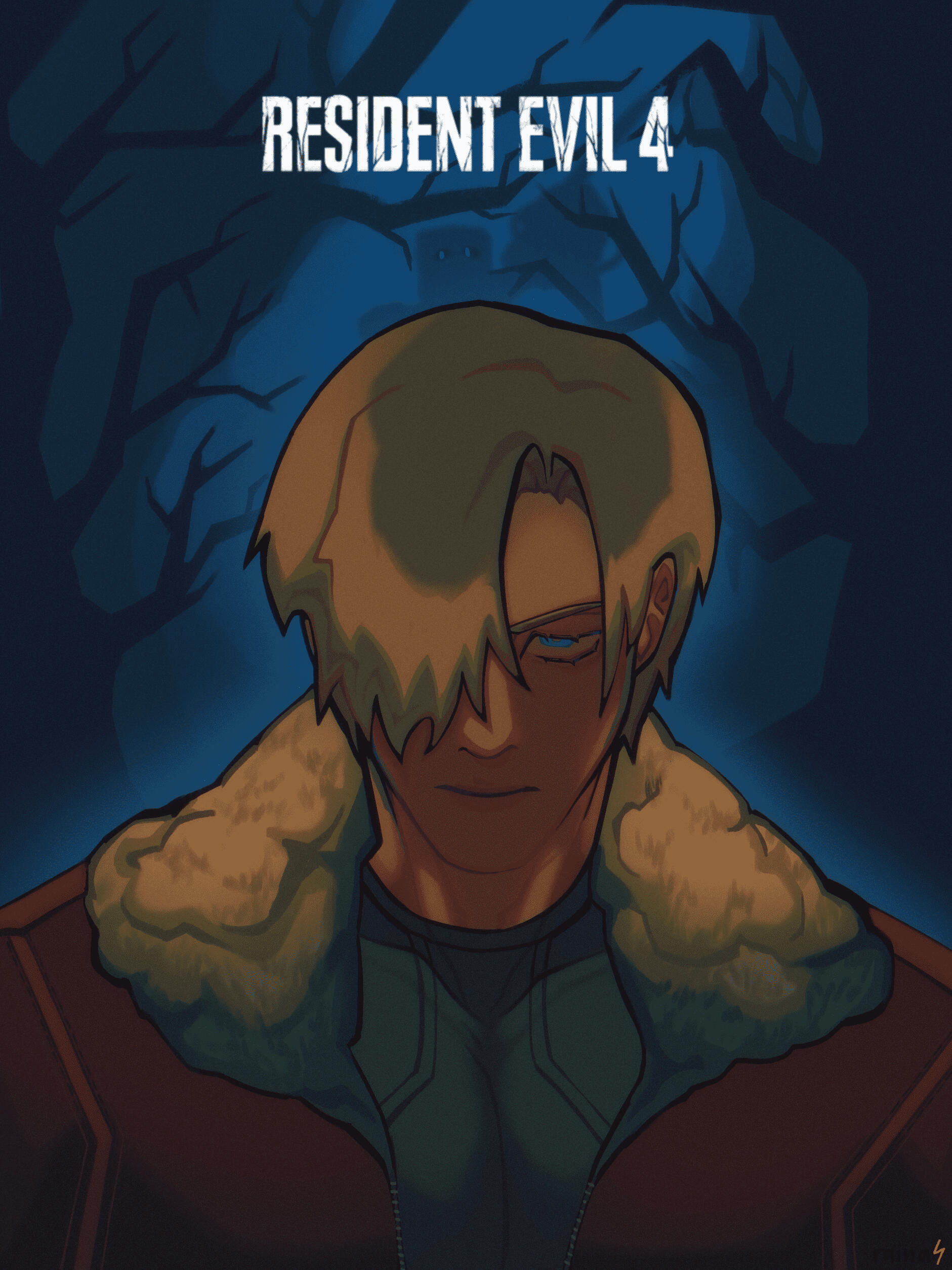 Poster-like illustration of Leon Kennedy as depicted in "Resident Evil 4 Remake" (Mar 2023)